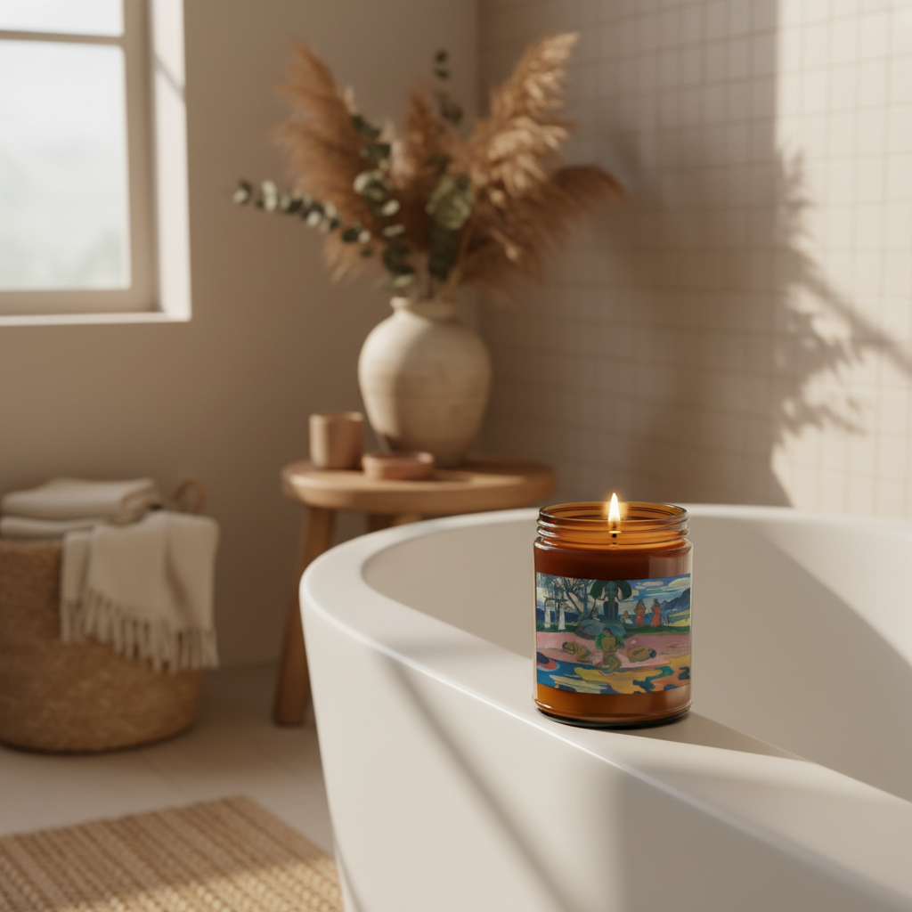 Candle jar featuring a vivid reproduction print of Paul Gauguin’s “Mahana no atua (Day of the God)” (1894). A striking art décor piece perfect for gifting or display.